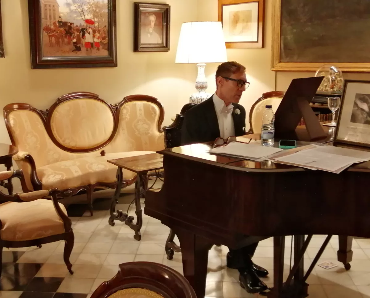Baladia va rebre els assistents al saló del palau, vestit d’esmòquing i al costat del piano de mitja cua, reconstruint una escena que ben segur era habitual cent anys enrere als salons de la casa d’Isabel Llorach, al carrer Muntaner, prop de la travessera de Gràcia. I va interpretar La la la, ça va, ça va, una cançó francesa dels anys vint, referent de la Belle Époque parisenca. Llorach era una ferma seguidora de la cultura francesa.