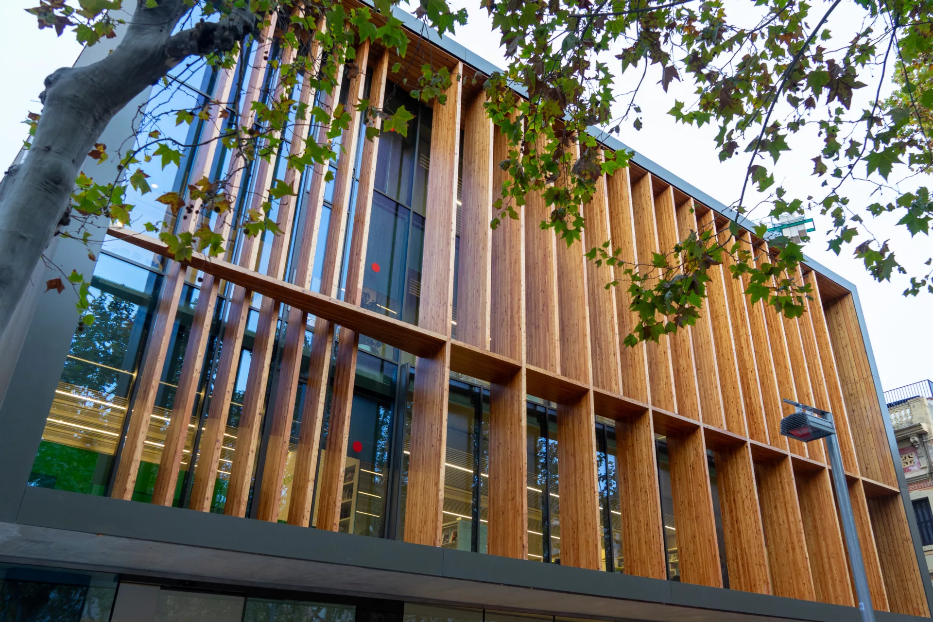 Les façanes estan acabades en alumini i vidre: d’una banda, amb un parament opac en forma de xapa grecada, i de l’altra, amb unes xapes perforades situades davant de la pell de vidre. La façana principal, que dona a la plaça i on s’ubica l’accés a l’edifici, es caracteritza per una composició a base de pilastres de diferents altures, segons la planta on es troben, disposades a diferents distàncies i ritmes. La planta baixa envidrada interpreta el volum com un cos suspès sobre la seva base.