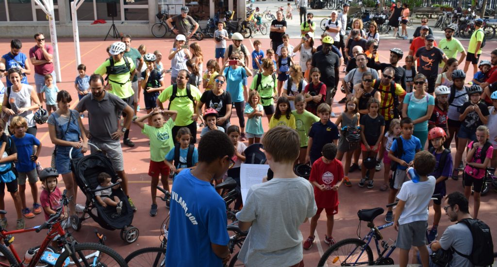 Just ha començat la cursa, el veïnat participant ha fet una parada a l’Escola Orlandai on Eva Ceano, presidenta de l’Associació de Veïns de Sarrià, ha introduït un manifest que han llegit dos alumnes de la mateixa escola. “Fa molt temps que anem reivindicant una ciutat més amable, on la prioritat siguin les persones i no els vehicles motoritzats” llegia Ceano entre aplaudiments.